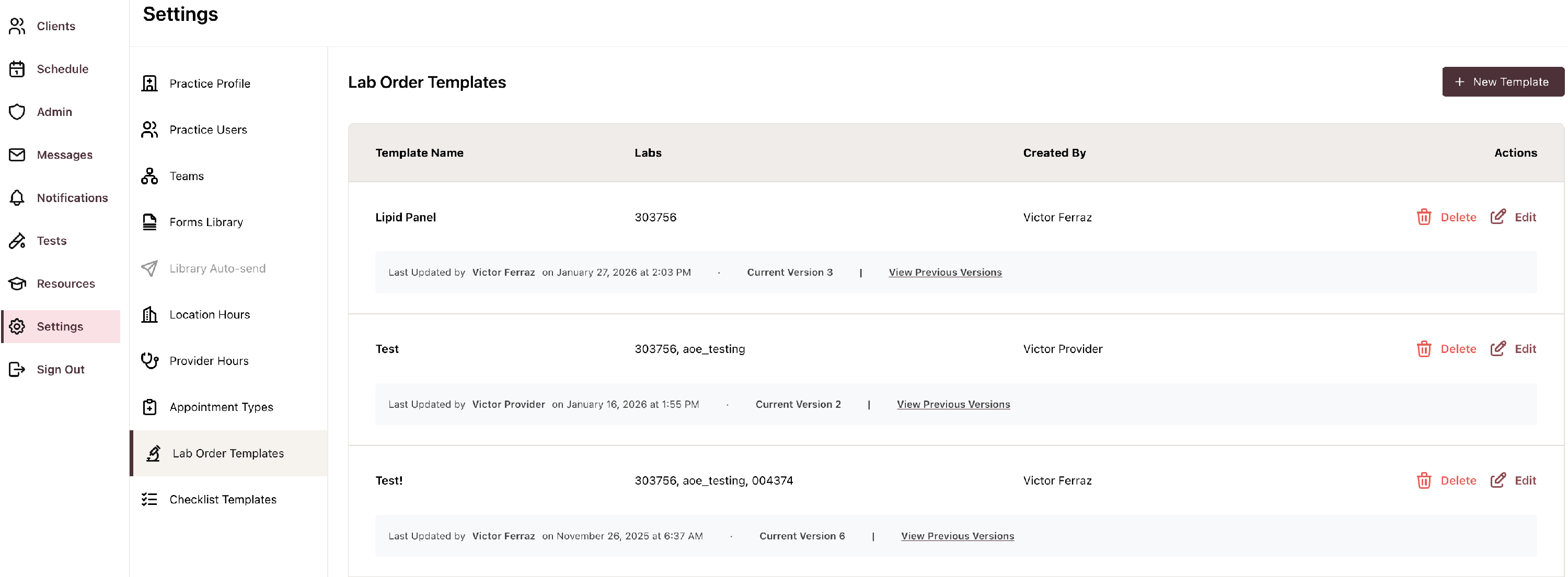 Lab Order Templates can be deleted at any time by navigating to the Lab Order Templates from the Settings menu.