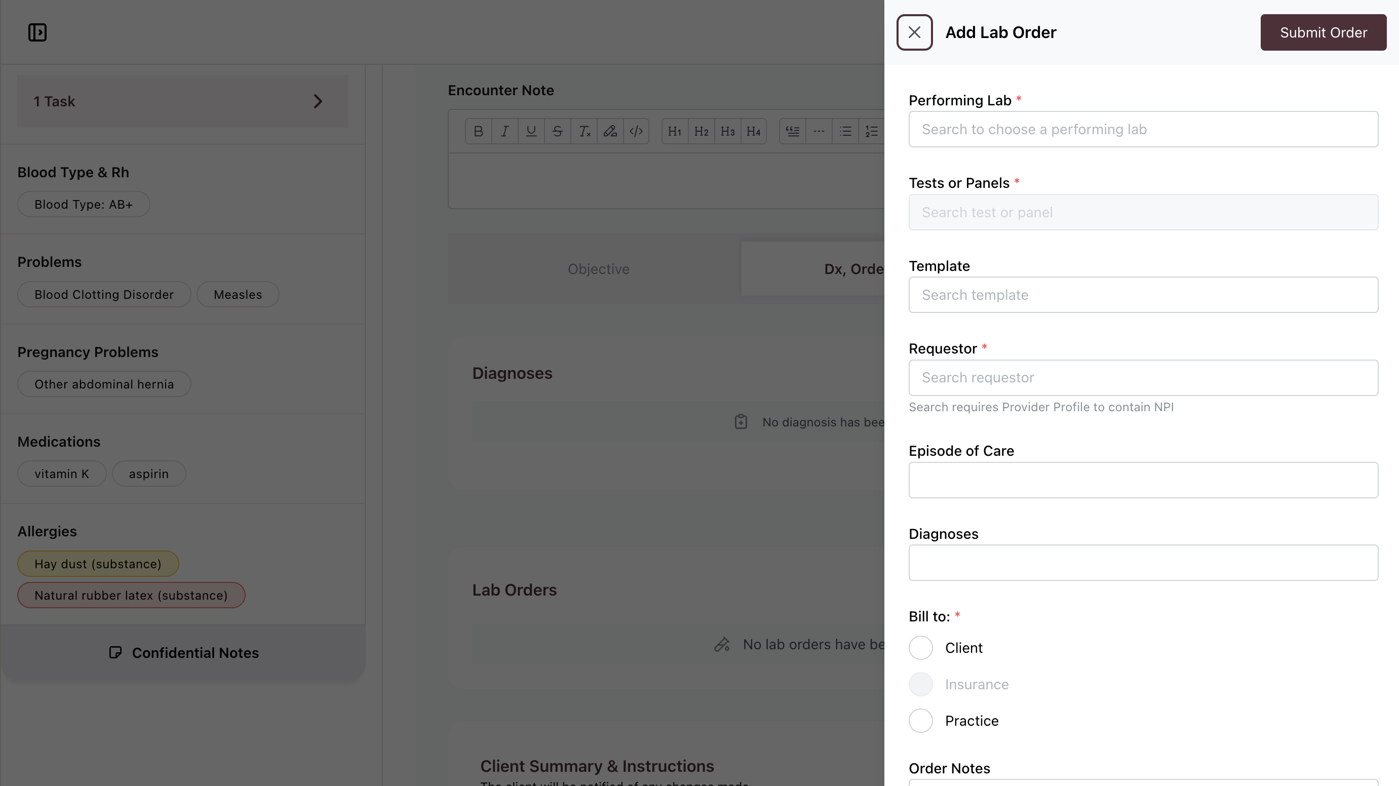 - (Optional) Diagnoses - Search for and select the relevant diagnosis associated with the lab order. Though this is not required, please note that this may impact insurance processing, if that is later selected.