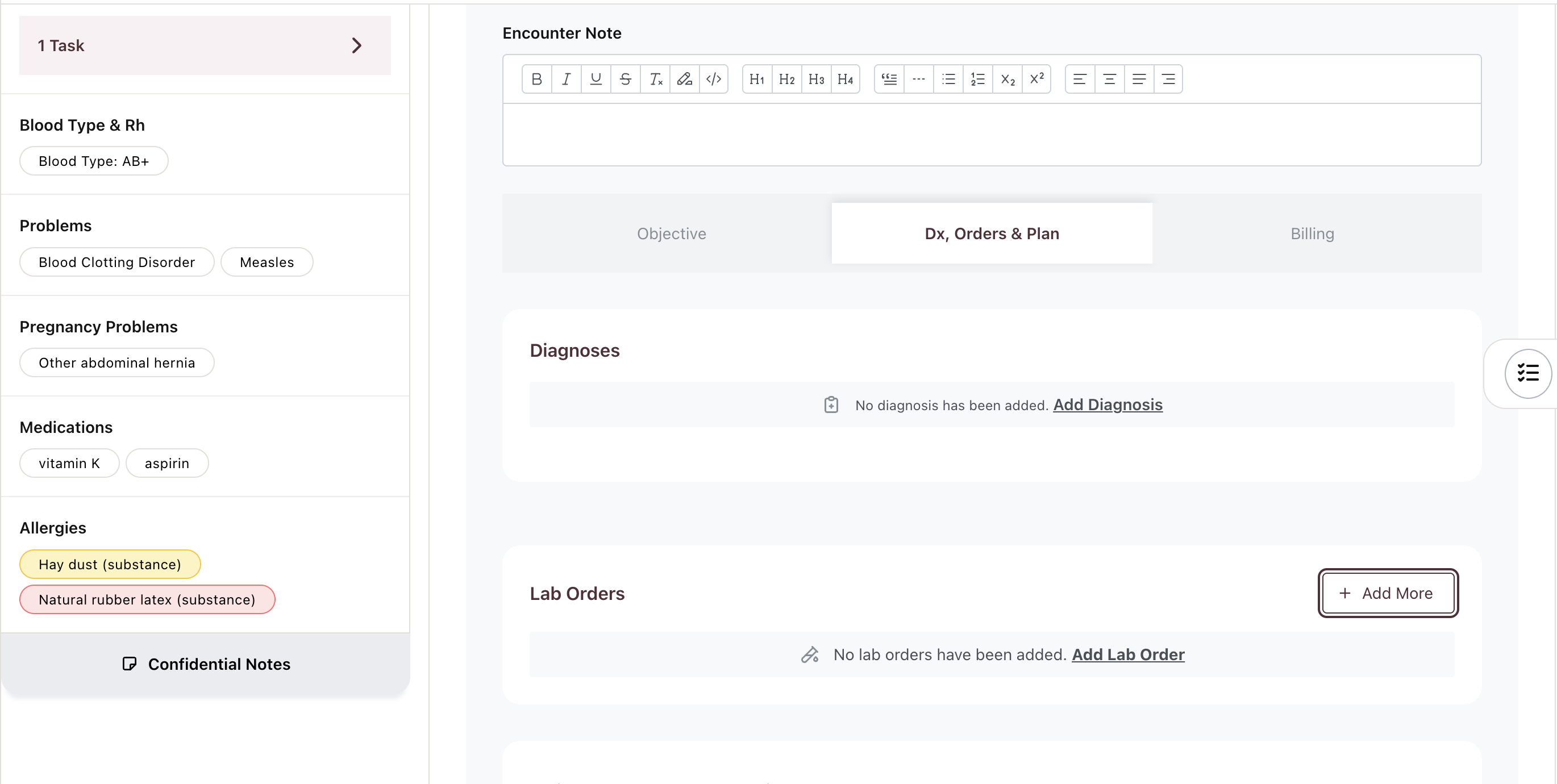 - Within the encounter, navigate to the Dx, Orders & Plan tab.